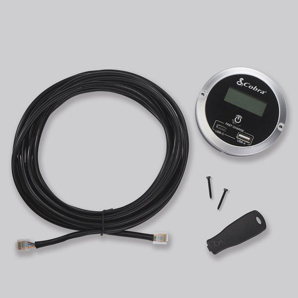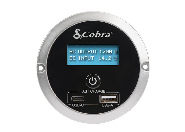View On/Off and Operating Status on all Cobra inverters 1500W and higher (On/Off Status for other models). Includes remote controller with USB-A and USB-C fast charge ports, RJ-45 cable, and mounting kit.