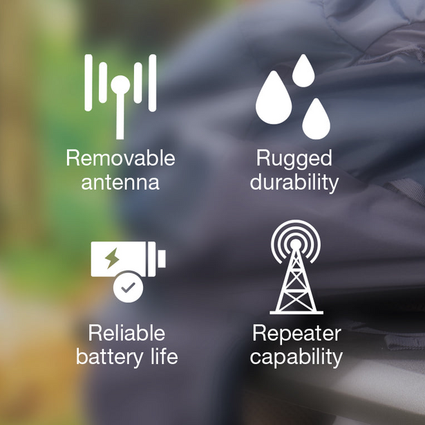 Go farther with over 2 watts of power, removable antenna options, and repeater capability.